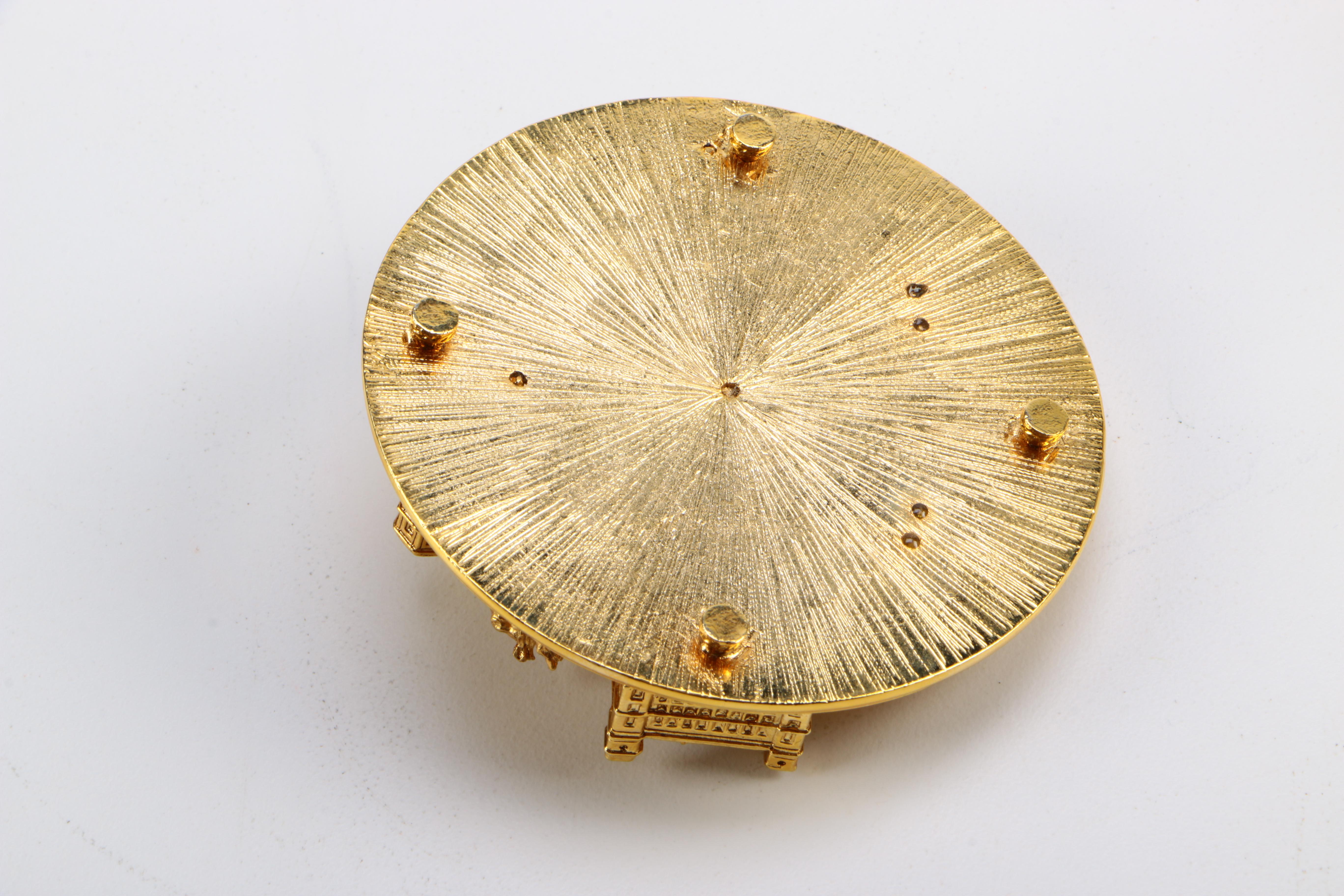 The egg opens to reveal a miniature gold replica of Gatchina Palace, the Dowager Empress's residence outside Saint Petersburg.